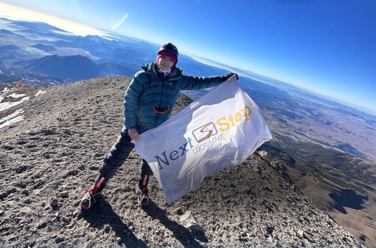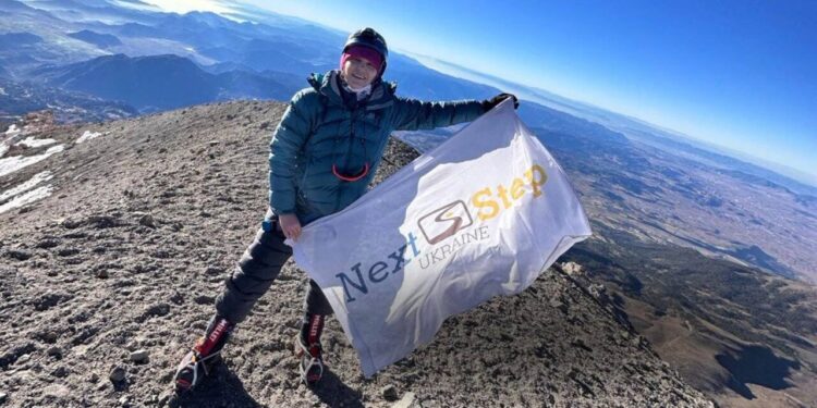 На вершині Орісаби Алевтина розгорнула прапор реабілітаційного центру Next Step Ukraine, який працює в Ірпені, надаючи допомогу воїнам, які відновлюються після тяжких поранень.