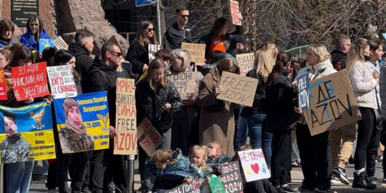 Насамперед — це родини захисників. Матері, дружини, діти військових, які не мають жодних новин від своїх близьких уже більше року. Вони приходять із плакатами, символікою полку “Азов”, національними прапорами, чорними стрічками та гірляндами на згадку про загиблих.