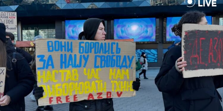 Учасники акції тримали плакати за гаслами на кшталт “Волю Azov”, “Полон вбиває”, “Вони зробили неможливе і ви зробіть” та інші.
