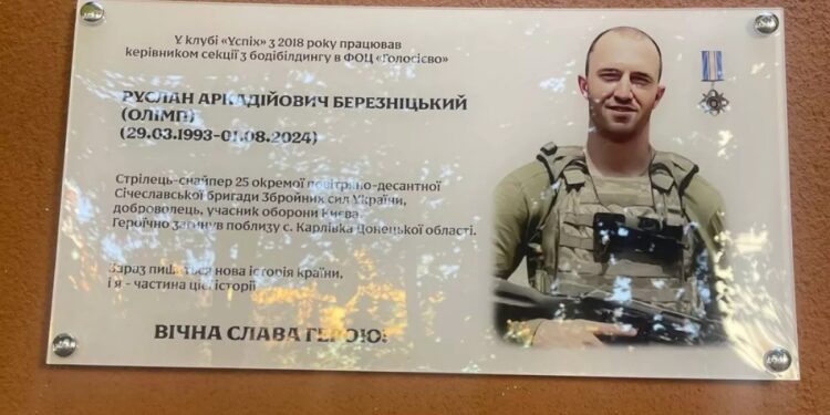 У фізкультурно-оздоровчому центрі «Голосієво» відбулося відкриття меморіальної дошки на честь Руслана Березніцького — тренера з бодибілдингу, воїна та людини великої мужності, який віддав життя у боротьбі за свободу України. Про це повідомила голова Голосіївської райдержадміністрації Софія Дунаєвська.