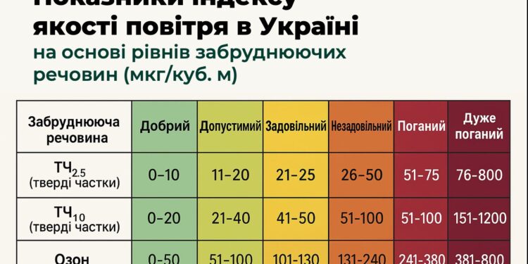 діапазони значень рівнів забруднюючих речовин, що визначають індекс якості;